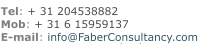 Faber Global Consultancy B.V. is undertaking various activities; such as coaching, market studies, sales plans implementation, preparing marketing plans, searching and updating distributors and consultancy to various customers in primarily in the business to business market.
